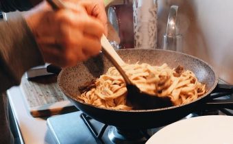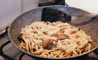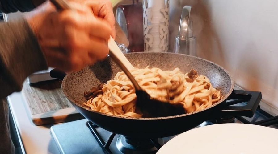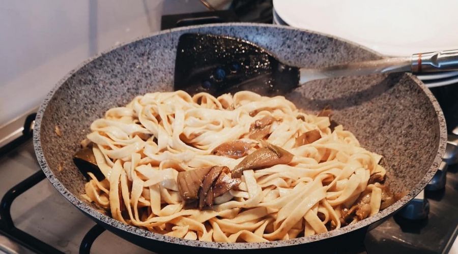 E infine, dopo aver cotto la pasta, uniamo le tagliatelle e i carciofi nel wok Tognana Porcellane della linea #Ambiziosa e lasciamo insaporire il tutto.