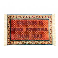 Tappeti in pet riciclato. Scritta impressa a fuoco, elemento fondamentale di tutte le culture e religioni del mondo. Le frasi, tutte dette da leader importanti occidentali Misure: 80x120 cm